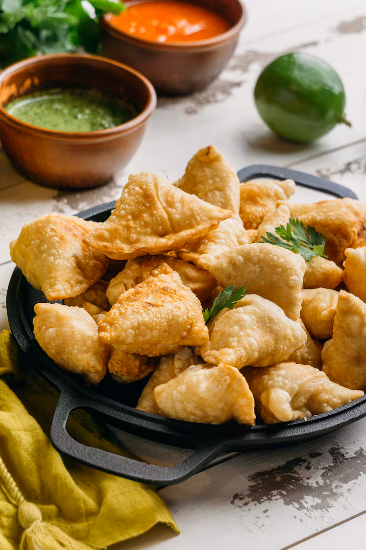 Puff pastry fritters stuffed with peas, potatoes and spices.